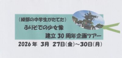Historyあゆみ・ふりかえり つくる会 あゆみ Study学び・学習 ナガサキ修学旅行ナガサキ修学旅行の要項、取り組み、まとめを3ページで掲載しています。続きはこちらふりそでの少女像が道しるべ少女像が導く学びの場を振り返ってみました。続きはこちら Relation関連情報 Book絵本「ふりそでの少女」、単行本「ナガサキに翔ぶ: ふりそでの少女像をつくった中学生たち」を紹介します。続きはこちらVideo報道動画等を掲載しています続きはこちらPresentationo会が創作したものを紹介します。“みらいいろ”作成の『つなぐ-ヒロシマから未来へ』を掲載しました。続きはこちらLink 続きはこちら FacebookXBlueskyHatenaCopy