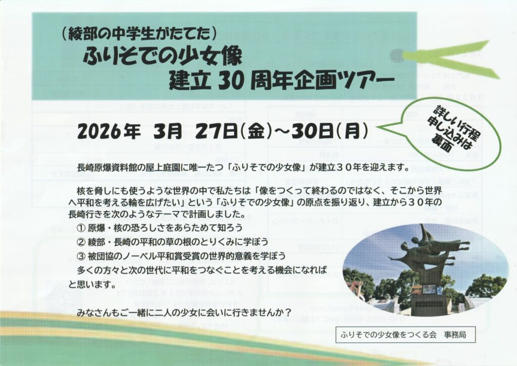 今年3月、ふりそでの少女像建立30年を迎えます。ナガサキの像の前で記念式典をするとともにフィールドワークなど様々な企画を考えました。28日には原爆資料館をピースバトンのガイドで1時間じっくり見学します。また、29日にはノーベル平和賞受賞式に参加された田中重光さんのお話を聞きます。新門司港へ向かう途中に原爆投下予定地だった小倉の勝山公園へ寄ります。チラシで詳細をご覧ください。普通の旅行では得られないものがたくさん詰まっています。